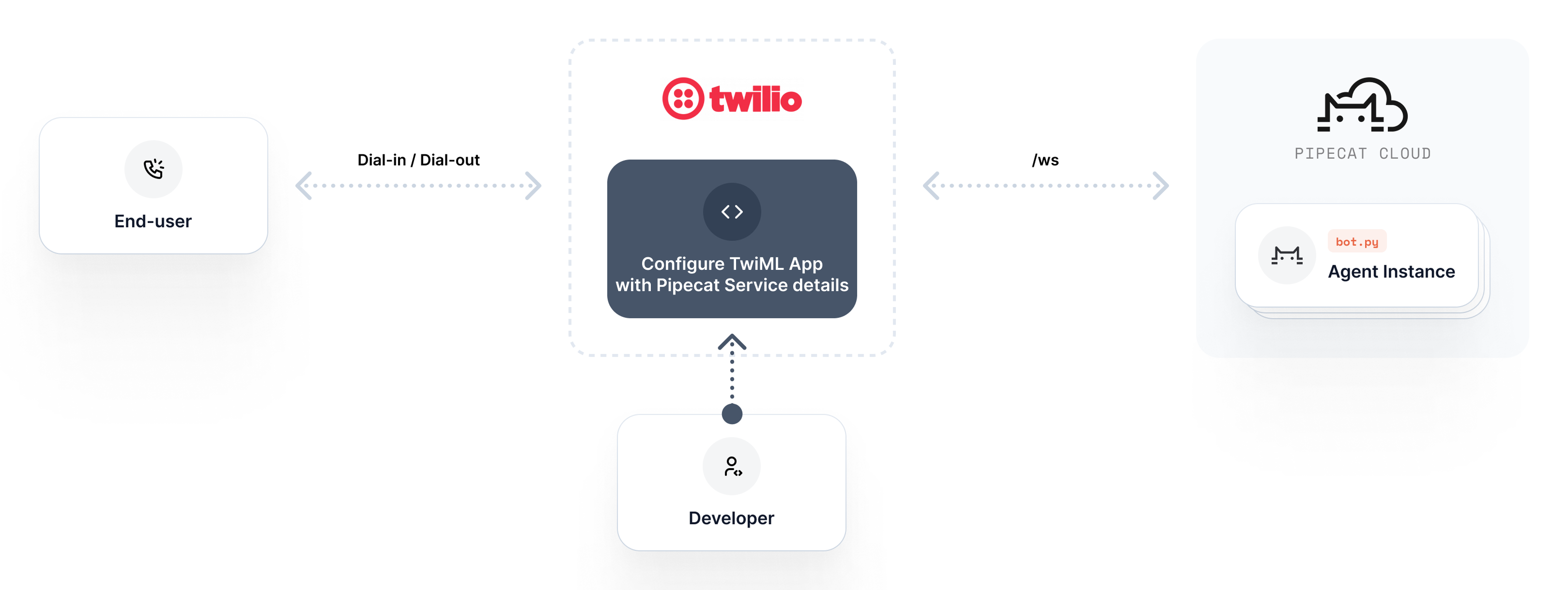 Pipecat Cloud implements Twilio’s bidirectional Media Streams protocol. While audio streams flow through WebSockets, the call session is controlled by updating the Twilio Markup Language (TwiML) associated with each call’s unique identifier (CallSid